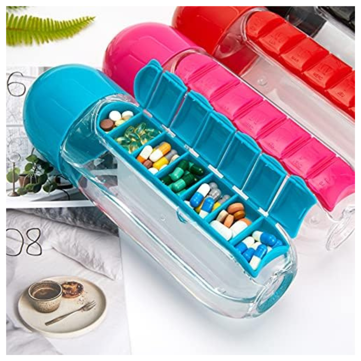 - Todo en uno: Disfruta de una botella de agua de 600 ml, un organizador de pastillas de 7 días y una taza, todo en un diseño elegante y portátil. 🥤💼